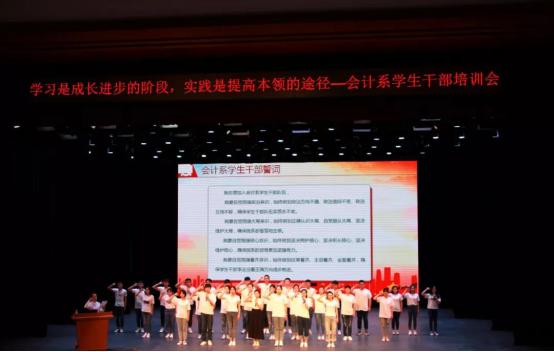 最后,由新媒体主任贾怡妮带领会计系全体学生干部进行了现场宣誓,誓词铿锵有力,表达着全体学生干部努力做好本职工作,为会计系发展全情奉献的决心和勇气。
