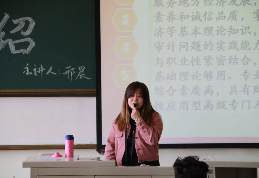 在509教室,我系邢晨老师为大一新生讲解了审计专业的相关介绍。从师资概况、培养目标、专业介绍、专业课程、专业要求、就业方向等六个方面进行讲解。