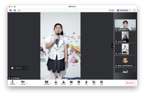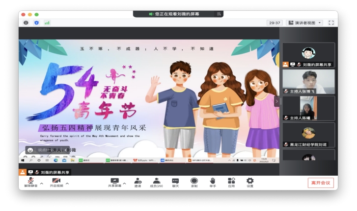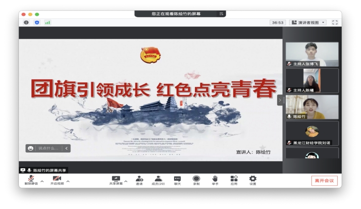 黑龙江财经学院刘雨蒙同学以“浓情六月天,欢乐度端午”、刘薇同学以“弘扬五四精神,展现青年风采”、陈荟竹同学以“团旗引领成长,红色点亮青春”为主题进行宣讲,宣讲了弘扬中华优秀传统文化,传承红色基因,增强青少年们的文化自信心和自豪感的重要性,教育引导广大青年学生学团史、强信念、践使命、跟党走。