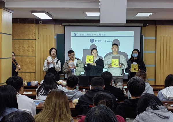 就业素质能力水平设立了教师讲解、自我介绍、模拟面试等环节。嘉易信财税集团人力资源总监刘雪珂通过案例教学向学生们讲解在就业环节中需要注意的事项,并带领学生现场模拟面试。