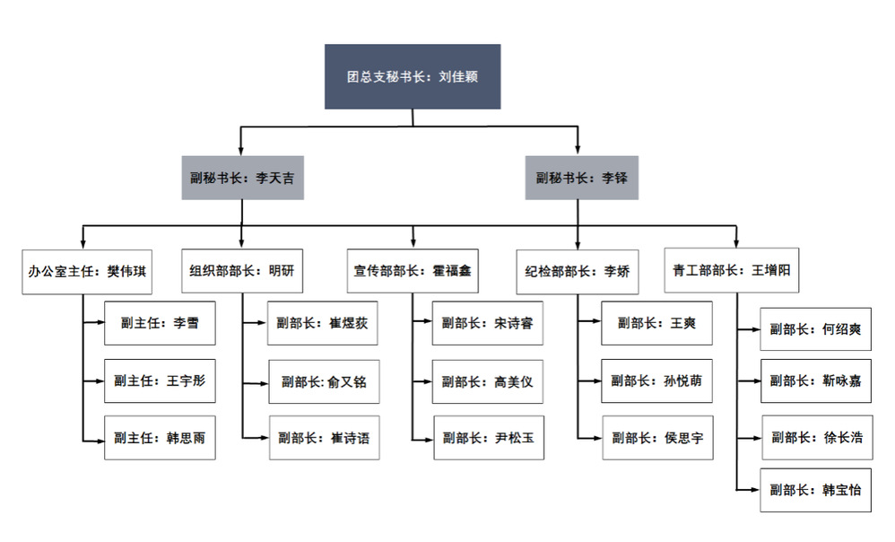 办公室是团总支的信息枢纽,协调各部门工作,保障团总支高效运转。做好值班工作的监督及情况统计,促进团总支干部精细化管理;负责建立健全团总支各项规章制度,逐步形成管理体系;对各种文件及活动进行记录,系统存档,做到工作有迹可循;撰写活动策划案,清晰呈现活动流程,使各项活动有序开展;及时发布各种工作通知,做好信息传递,加强人员沟通。作为团总支的枢纽部门,在各部门之间起着重要的协调和沟通作用,致力于成为团总支发展的桥梁。