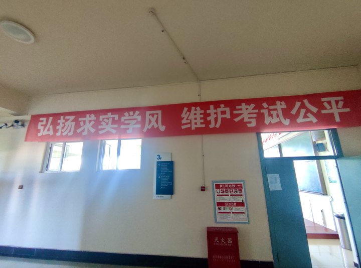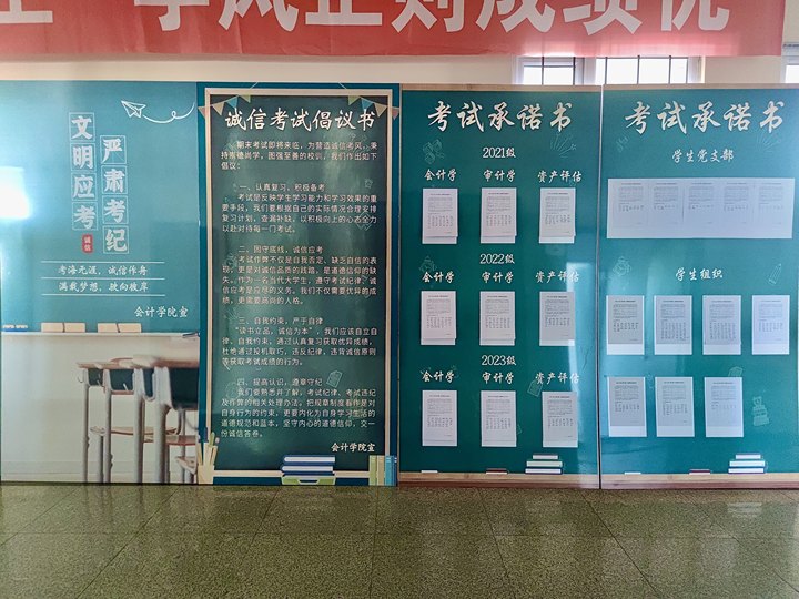 会计学院在走廊悬挂起了一系列宣传横幅及考试倡议书,旨在时刻提醒和鼓舞每一位学子,在即将到来的期末考试中将诚实守信作为行为的准则。相信在会计学院全体同学的共同努力下,我们一定能够营造出更加优良的学风和考风,为会计学院今后的学风建设工作奠定坚实的基础。
