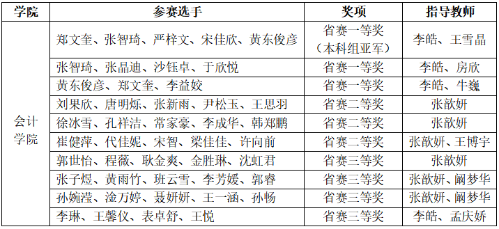本次竞赛对学生深入开展专业与创新创业融合教育深有帮助,会计学院教师带领学生积极参与,以下是会计学院竞赛的获奖情况: