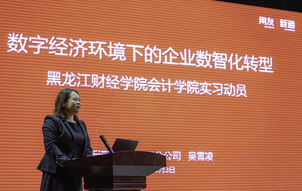 企业代表新道科技黑龙江分公司市场总监吴雪凌就数字经济环境下的企业数智化转型,与同学们分享了会计行业的发展趋势,以及实习中应具备的技能和态度,让学生们对即将面对的职场环境有了更直观的了解。