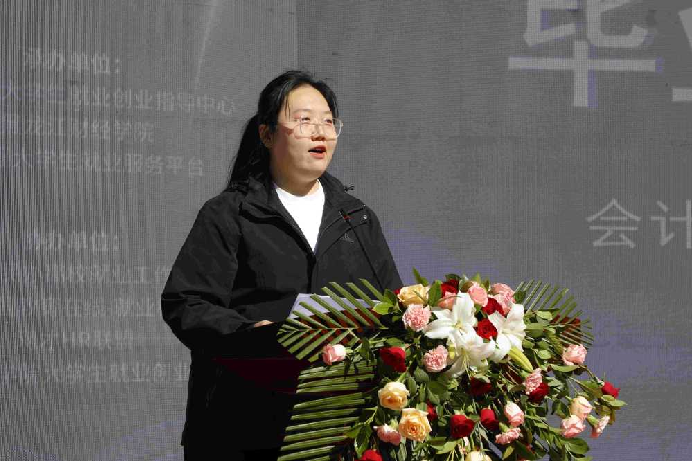 2021级审计学赵舒畅代表毕业生发言,她对学校为毕业生搭建的广阔就业平台、对用人单位的信任表示感谢,并号召同学们行动起来,积极与企业代表沟通,了解企业文化和岗位需求,展现专业能力和个人魅力。