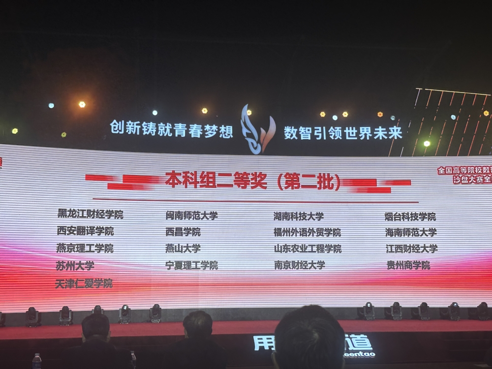 9月22日,2024年全国高等院校数智化企业经营沙盘大赛全国总决赛在河南郑州成功落下帷幕。本届大赛由中国商业联合会、新道科技股份有限公司主办,郑州大学、郑州市财贸学校等联合承办,大赛共有来自全来自各地的281支队伍参赛。我校由会计学院赵国艳、刘鑫老师带领李进文、李乔喜、李龙、邹佳依四名同学参加了此次比赛。经过一天激烈角逐,我院学子以默契的团结合作精神、扎实的专业知识积累、严谨的分析和良好的心理素质荣获2024年全国高等院校数智化企业经营沙盘大赛总决赛“二等奖”。