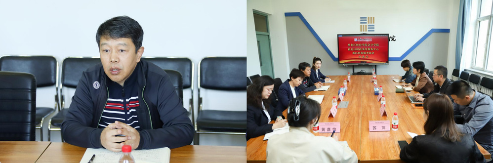 5 月 23 日上午,松北区财政事务服务中心主任颜莉娜、副主任姜雪,携手哈尔滨新区财税服务协会会长刘智超、副会长付圣轩、秘书长苏萍等一行7人到我校会计学院进行交流洽谈。会计学院院长吕广仁、副院长安慧心等人出席会议,吕院长主持会议并致辞。